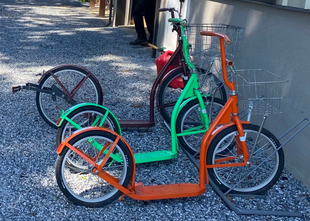 Struggling up a steep slope, legs burning, sweat dripping into our eyes, lungs gasping for air, we were surprised by an older lady serenely cruising past us, shortly followed by her husband. She was riding a sit-up bicycle with a wicker basket on the front and looked as if she was pottering down to the local market.